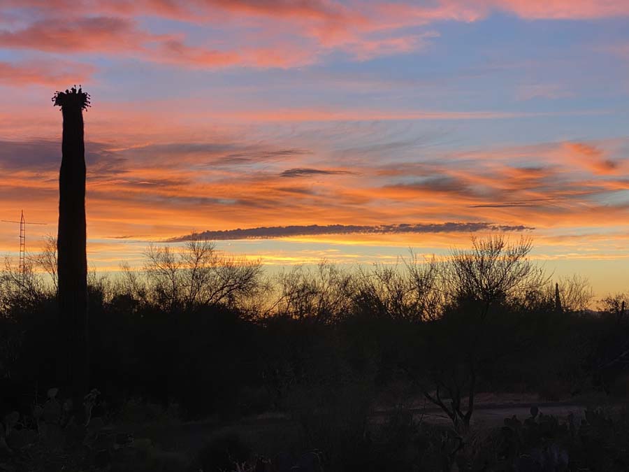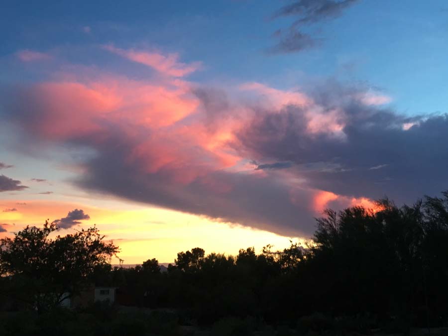 I’m familiar with the spectacular sunsets of Key West, Florida, but I truly believe the skies in the Tucson area are the most consistently amazing in the world. The wide-open desert landscape only enhances the immensity of the sky. I am constantly snapping photos of atmospheric phenomena—moments I want to preserve or use as inspiration for future writing.