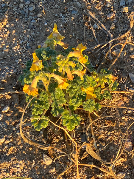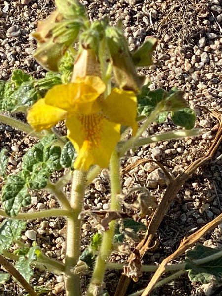 This fall, I’ve been enjoying the splash of yellow in my yard. Most of the plants are dried and faded, sandy tan like the desert sand, when out pops this visual relief. The leaves reminded me of geraniums, so was this a desert geranium? No. The flowers have a snapdragon look, but this is not a snapdragon.