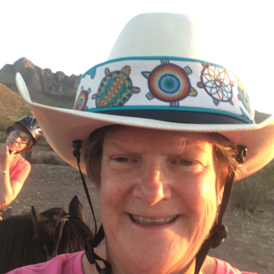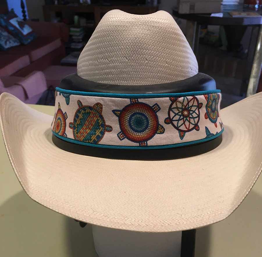 Many equestrian competitors have helmets covered with bling or looking like fancy dresses. However, for recreational riders, some helmets are decorated like cowboy hats. I had a friend create a fancy band to go over the thick protective area. I selected some colorful turtle-themed material, and she did a great job.