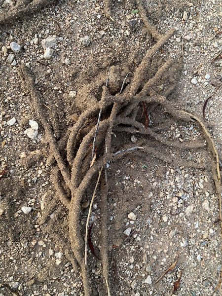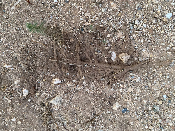 What is happening that I would deign compare it to the colorful transformation of the wooded landscape? It’s the recycling of the environment. Unfortunately, the colors are only of sand or tan. The stick is covered with soil stuck together with saliva. How they manage to produce that much saliva in the arid desert, I don’t know. Then the workers scrape away the enclosed twig, which creates hollow tubes of sand. These termites cannot drill into ‘sound’ wood but are limited to building these characteristic encrustings.