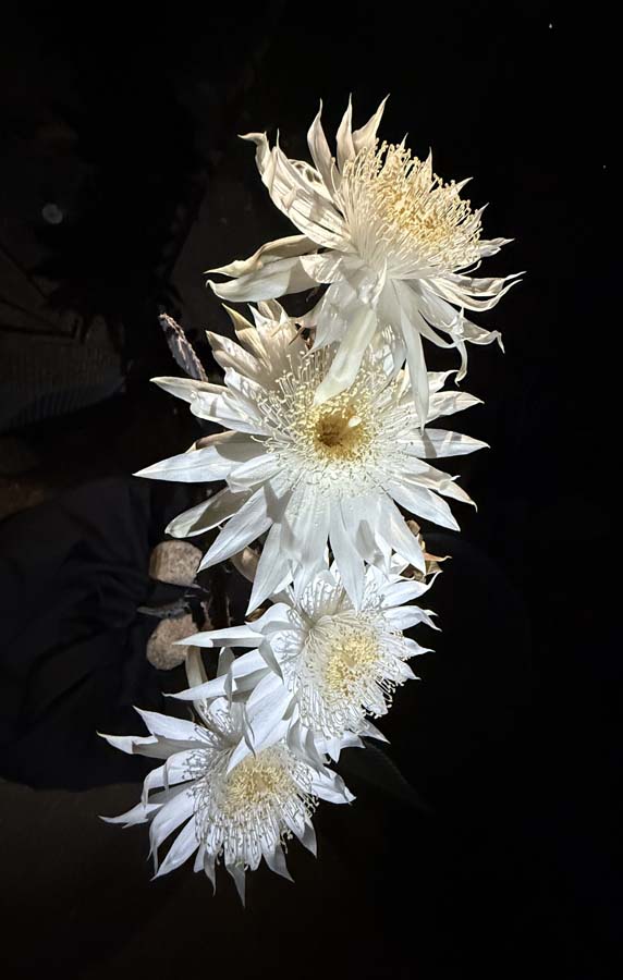 I’m often asked if the flowers have a scent. While I personally don’t detect one, I’ve heard others claim they do, describing it as a light, sweet fragrance. Scent or not, their beauty is undeniable. And as always, their royal display is fleeting. By dawn, the magnificent flowers will have wilted.