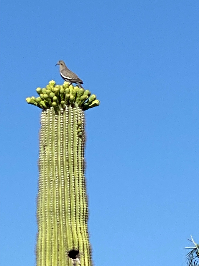 Seeing the lush flowering of this important, iconic cactus is reassuring. These important plants are more than decorations for Western TV shows and movies. The flowers open at night and close the next afternoon, but the flowering season lasts for several weeks. All they get is 24 hours to be pollinated. The saguaro is, of course, a keystone species of the Sonoran Desert ecosystem. Bats, moths, and birds pollinate the flowers. They are attracted by the saguaro’s nectar and appealing odor. The bird on top of the saguaro above is a white-winged dove (Zenaida asiatica). The saguaro is the dove’s preferred food.