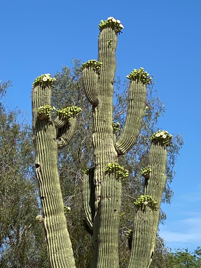 Even though the Tucson area had rain over the winter, the precipitation can be spotty. A saguaro in an area with lower rainfall or extreme heat might be stressed and have reduced top flowers. Maybe that’s what’s going on with the scattered side-flowered saguaros. They are few and far between, as the saying goes.